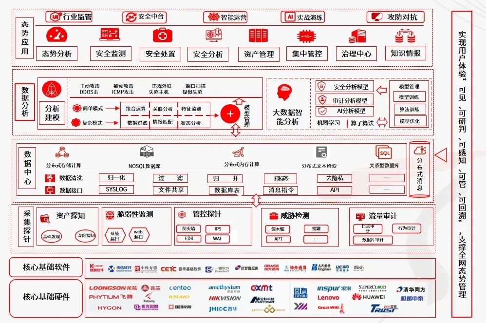 在智能化自动清静防御系统中,,,,,,,,3377体育网官网入口基于与国产软硬件企业的深度合作与团结手艺攻关,,,,,,,,将清静手艺与国产化情形周全融合,,,,,,,,凭证“统筹协调、上下联动、数据共享、清静高效”的原则,,,,,,,,搭建起一体化智能网络清静态势剖析与清静运营平台,,,,,,,,周全提升“监测发明、剖析研判、转达预警、应急处置惩罚、事务剖析、追踪溯源、情报信息、指挥调理”等清静能力,,,,,,,,形成信创情形下的网络清静态势感知与清静运营能力。。。。。。。