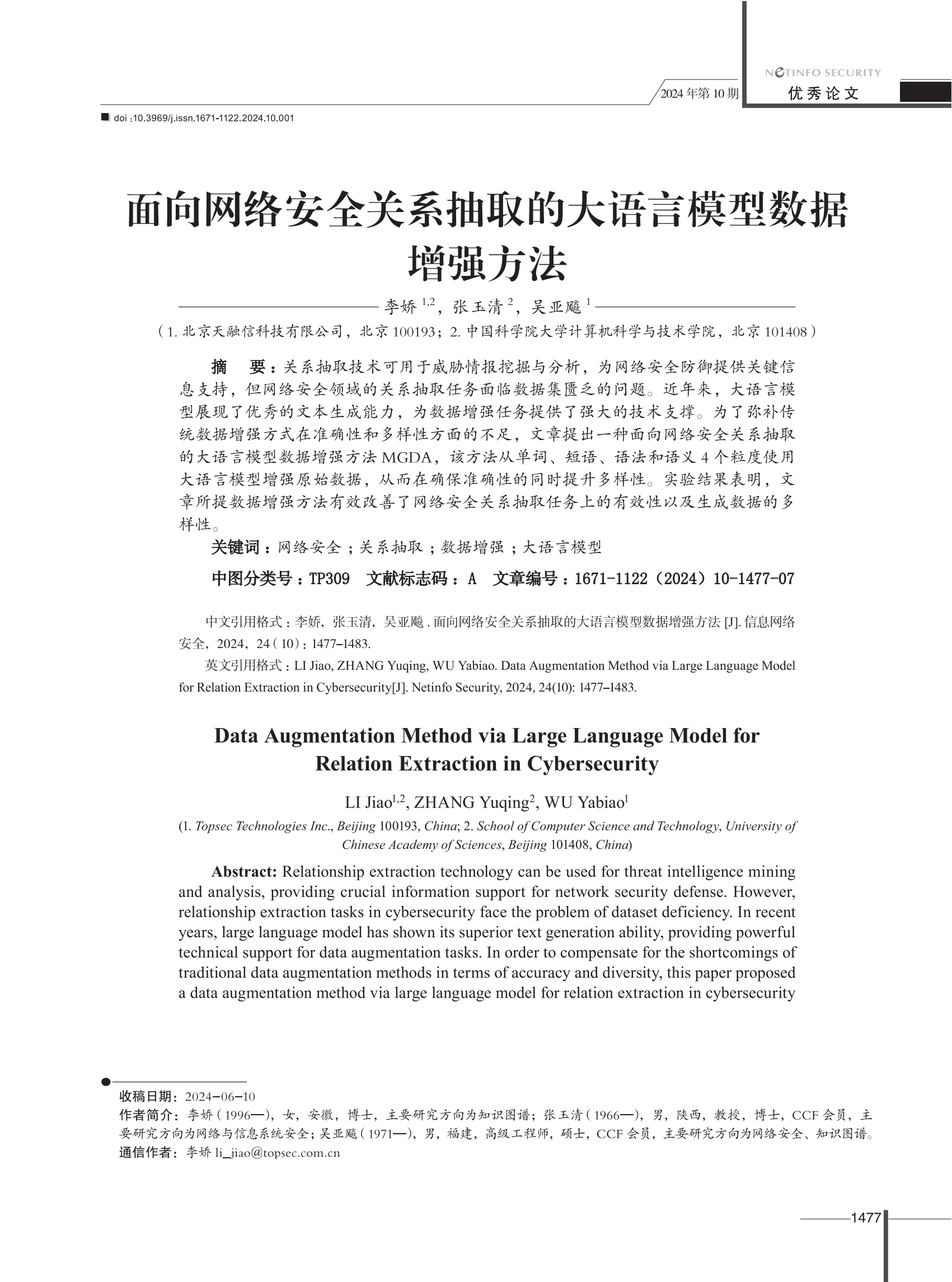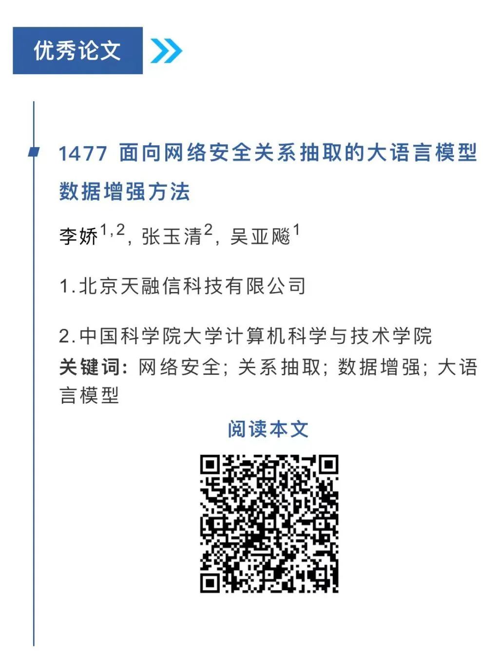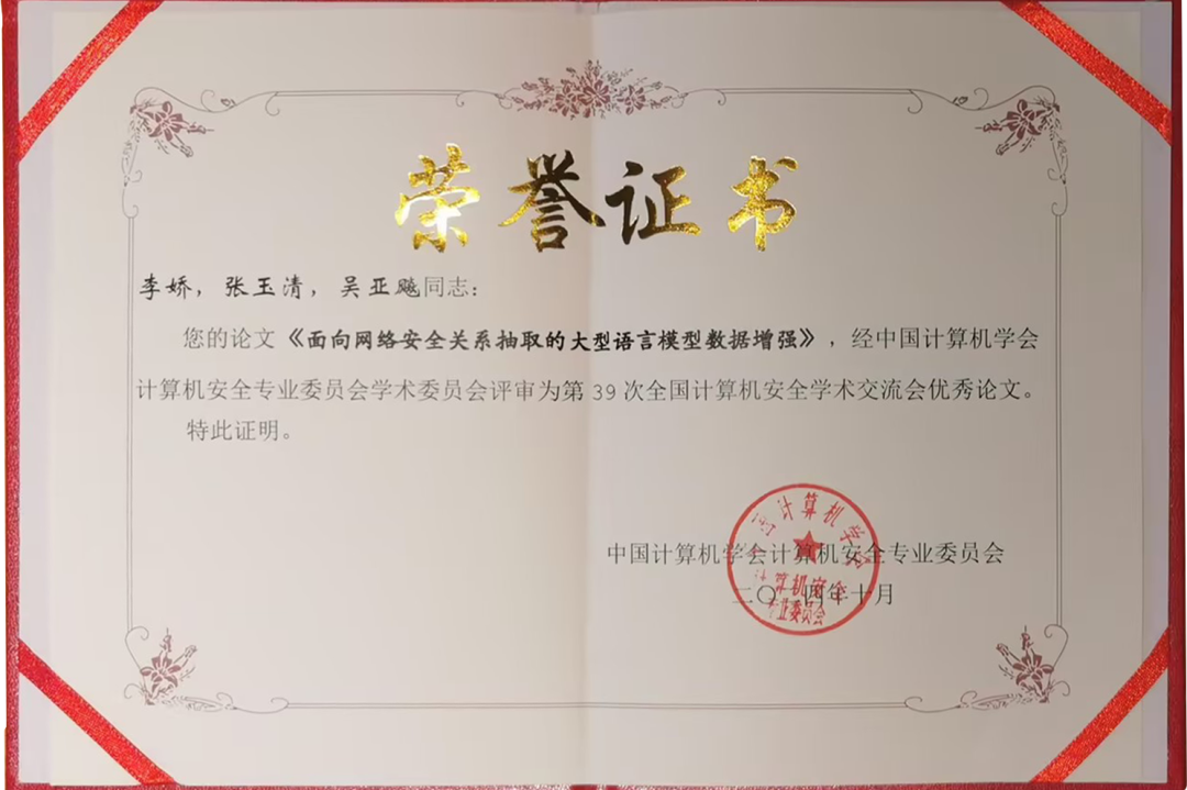 日前,,,,,,第39次天下盘算机清静学术交流会在西愉逸成举行,,,,,,作为运动主要环节,,,,,,本届优异论文评选效果在运动现场重磅揭晓。。。。。。。。3377体育网官网入口李娇、吴亚飚,,,,,,中国科学院大学盘算机科学与手艺学院张玉清撰写的《面向网络清静关系抽取的大型语言模子数据增强》,,,,,,从496篇论文中脱颖而出,,,,,,成为本届唯一的优异论文,,,,,,并刊登于《信息网络清静》2024年第10期。。。。。。。。