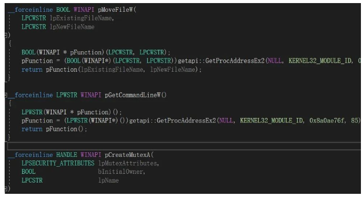 ͨ¹ý__forceinlineÄÚÁªº¯ÊýGetProcAddressEx2¶¯Ì¬»ñÈ¡ËùÐèÒªµÄAPIº¯ÊýµØÖ·£¬£¬£¬£¬£¬£¬£¬£¬Ö÷Òª×÷ÓÃÊÇÔÚµ¼Èë±íÖÐÒþ²ØËùÐèÒªµÄAPIº¯Êý£¬£¬£¬£¬£¬£¬£¬£¬±ÜÃâ±»yaraµÈ¹æÔò¾²Ì¬Æ¥ÅäÆÊÎö¡£¡£¡£¡£¡£¡£C++ÖÐinlineºÍ__inline֪ͨ±àÒëÆ÷½«¸Ãº¯ÊýµÄÄÚÈÝ¿½±´Ò»·Ý·ÅÔÚŲÓú¯ÊýµÄµØ·½£¬£¬£¬£¬£¬£¬£¬£¬Õâ³ÆÖ®ÎªÄÚÁª¡£¡£¡£¡£¡£¡£ÄÚÁªïÔÌÁ˺¯ÊýŲÓõĿªÏú£¬£¬£¬£¬£¬£¬£¬£¬µ«È´ÔöÌíÁË´úÂëÁ¿¡£¡£¡£¡£¡£¡£__forceinlineÒªº¦×Ö²»»ùÓÚ±àÒëÆ÷µÄÐÔÄܺÍÓÅ»¯ÆÊÎö¶øÒÀÀµÓÚ³ÌÐòÔ±µÄÅжϾÙÐÐÄÚÁª¡£¡£¡£¡£¡£¡£